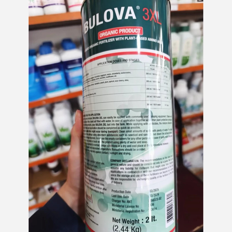 کود اسید آمینه محرک رشد بولووا 3 ایکس ال (کود آلی ان کا و اسیدآمینه) ترکیه کود آلی ان کا و اسیدآمینه ، محرک رشد نیتروژن کل (N): 3%،نیتروژن آلی (N):3%، پتاسیم محلول در آب (K2O):3%، اسیدآمینه آزاد:12%، ماده آلی:20%، کربن آلی: 8% 2 لیتر (مایع) محصولی ارگانیک حاوی ترکیبی از اسیدهای آمینه مورد نیاز گیاهان به همراه نیتروژن و پتاسیم می باشد. مصرف آن می تواند در زمان های مختلف اثرات متفاوتی را در گیاهان نشان دهد. بطور کلی گیاهان بعنوان تولید کننده اسیدهای آمینه در چرخه حیات بشمار می آیند. از طرفی فرایند تولید اسیدآمینه بخودی خود نیاز به صرف انرژی بسیار زیادی توسط گیاه دارد. به همین منظور با استفاده از اسید آمینه ها در زمان های حساس دوره رشد و نمو گیاهان همانند زمان گلدهی و یا رنگ آوری میوه ها و همچنین در زمان بروز تنش های مختلف مانند شوری، کم آبی و یا اثرات حاصل ازسوء مصرف سموم دفع آفات نباتی می توان به بهبود شرایط گیاهان و همچنین افزایش کارایی گیاه کمک بسیار زیادی نمود. وجود مقادیر بالایی از اسیدآمینه آزاد و قابل جذب در محصول BULOVA 3XL می تواند کمک مناسبی برای تقویت گباهان در مراحل مختلف و حساس دوره رشد و نمو تمامی گیاهان باشد