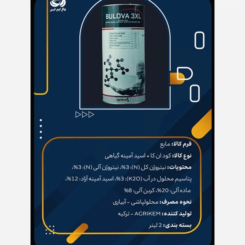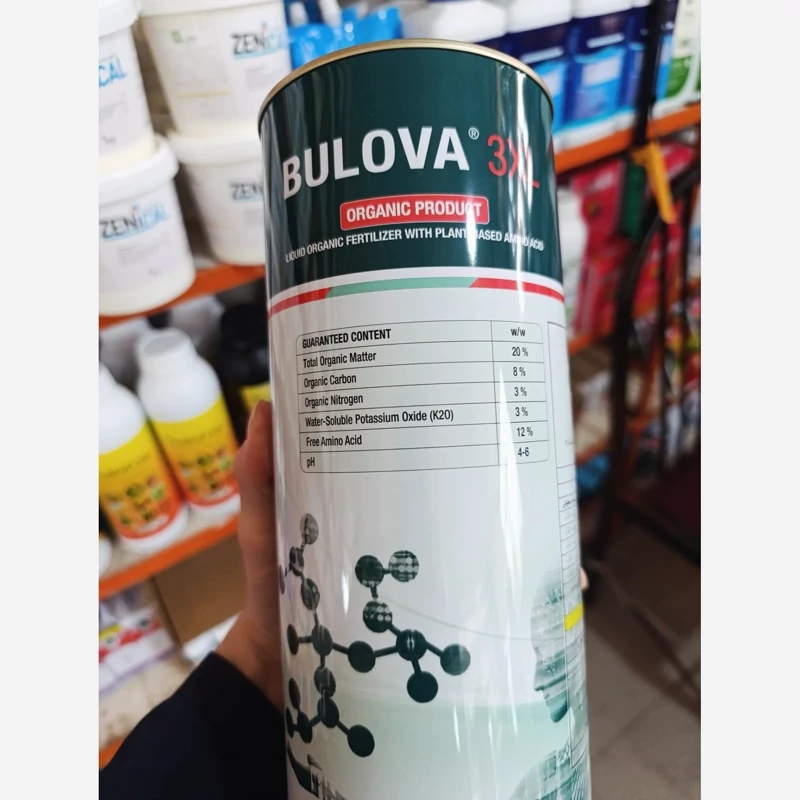 کود اسید آمینه محرک رشد بولووا 3 ایکس ال (کود آلی ان کا و اسیدآمینه) ترکیه کود آلی ان کا و اسیدآمینه ، محرک رشد نیتروژن کل (N): 3%،نیتروژن آلی (N):3%، پتاسیم محلول در آب (K2O):3%، اسیدآمینه آزاد:12%، ماده آلی:20%، کربن آلی: 8% 2 لیتر (مایع) محصولی ارگانیک حاوی ترکیبی از اسیدهای آمینه مورد نیاز گیاهان به همراه نیتروژن و پتاسیم می باشد. مصرف آن می تواند در زمان های مختلف اثرات متفاوتی را در گیاهان نشان دهد. بطور کلی گیاهان بعنوان تولید کننده اسیدهای آمینه در چرخه حیات بشمار می آیند. از طرفی فرایند تولید اسیدآمینه بخودی خود نیاز به صرف انرژی بسیار زیادی توسط گیاه دارد. به همین منظور با استفاده از اسید آمینه ها در زمان های حساس دوره رشد و نمو گیاهان همانند زمان گلدهی و یا رنگ آوری میوه ها و همچنین در زمان بروز تنش های مختلف مانند شوری، کم آبی و یا اثرات حاصل ازسوء مصرف سموم دفع آفات نباتی می توان به بهبود شرایط گیاهان و همچنین افزایش کارایی گیاه کمک بسیار زیادی نمود. وجود مقادیر بالایی از اسیدآمینه آزاد و قابل جذب در محصول BULOVA 3XL می تواند کمک مناسبی برای تقویت گباهان در مراحل مختلف و حساس دوره رشد و نمو تمامی گیاهان باشد