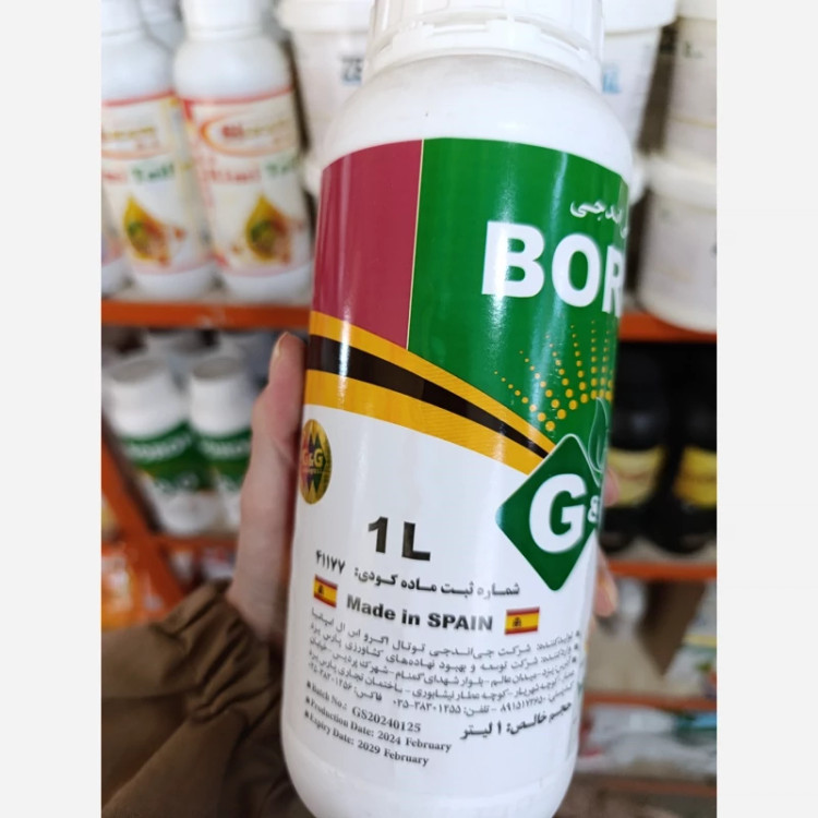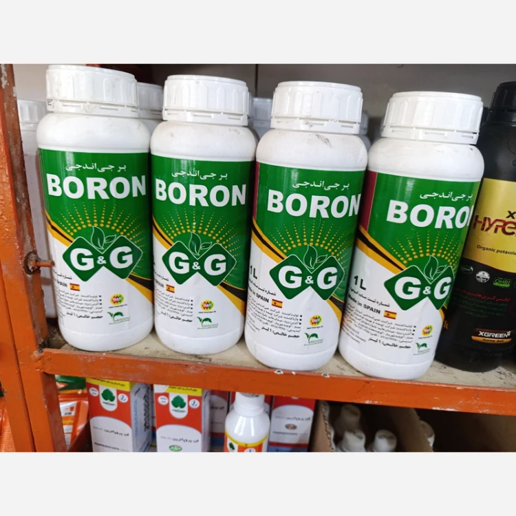 کود بر(B) جی اند جی اسپانیا | BORON G&G کود بر جی اند جی، حاوی عنصر بر بوده که به منظور جلوگیری از ایجاد کمبود و همچنین رفع کمبود این عنصر بسیار موثر بوده و قابل استفاده میباشد. بر محلول (B) 11 درصد عنصر بور تسریع کننده انتقال قند از اندام سبز گیاه به برگ و میوه میباشد این عنصر همچنین به عنوان محرک و تشدید کننده جذب و انتقال کلسیم در اندام گیاهی محسوب می شود. 👈فایده مهم دیگر این عنصر کمک به افزایش باردهی به صورت کمک به تلقیح گلها و تشکیل میوه و نیز جلوگیری از ریزش میوهها میباشد کود بور معمولاً با کودهای نیتروژنی، فسفاتی و پتاسیمی به خوبی مخلوط میشود. تداخل: ممکن است با کودهای حاوی کلسیم و منیزیوم تداخل داشته باشد و تأثیر منفی بر pH خاک بگذارد. همچنین، تداخل با مواد شیمیایی دیگر ممکن است بر جذب عناصر مغذی تأثیر بگذارد. نکته: هنگام استفاده حتما به میزان استفاده از این کود توجه شود . چون باعث مسمومیت خاکی می گردد.