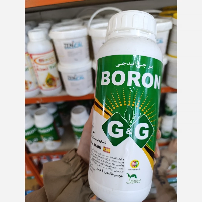 کود بر(B) جی اند جی اسپانیا | BORON G&G کود بر جی اند جی، حاوی عنصر بر بوده که به منظور جلوگیری از ایجاد کمبود و همچنین رفع کمبود این عنصر بسیار موثر بوده و قابل استفاده میباشد. بر محلول (B) 11 درصد عنصر بور تسریع کننده انتقال قند از اندام سبز گیاه به برگ و میوه میباشد این عنصر همچنین به عنوان محرک و تشدید کننده جذب و انتقال کلسیم در اندام گیاهی محسوب می شود. 👈فایده مهم دیگر این عنصر کمک به افزایش باردهی به صورت کمک به تلقیح گلها و تشکیل میوه و نیز جلوگیری از ریزش میوهها میباشد کود بور معمولاً با کودهای نیتروژنی، فسفاتی و پتاسیمی به خوبی مخلوط میشود. تداخل: ممکن است با کودهای حاوی کلسیم و منیزیوم تداخل داشته باشد و تأثیر منفی بر pH خاک بگذارد. همچنین، تداخل با مواد شیمیایی دیگر ممکن است بر جذب عناصر مغذی تأثیر بگذارد. نکته: هنگام استفاده حتما به میزان استفاده از این کود توجه شود . چون باعث مسمومیت خاکی می گردد.