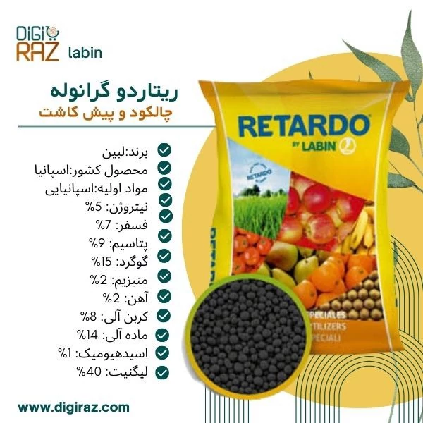 کود کامل ارگانیک ریتاردو اسپانیا | RETARDO ریتاردو کودی کامل و ارگانیک مناسب مصرف چهار فصل ویژه چالکود با مجموعه ای از عناصر کندرهش کاهش pH خاک کمک به بهبود ساختار خاک افزایش حاصلخیزی خاک RETARDO ساخت کمپانی LABIN اسپانیا بهترین فصل به جهت تقویت و آماده سازی زمین، گیاهان و درختان میوه برای شروع فصل بهار میباشد. کود ریتاردو دیر حل شده (در اصطلاح کندرهش میباشد) که این ویژگی در کودهای چالکود از اهمیت بالایی برخوردار میباشد. کود ارگانیک ریتاردو حاوی پایه ارگانیک بوده و به این دلیل است که براساس واکنش گیاهی لیگنیت تولید میشود و کندرهش بودن آن باعث میگردد که نیازهای غذایی گیاه را برآورده سازد، در نهایت ریتاردو تاثیر بسیار خوبی در حاصلخیزی و بهبود ساختار خاک میگذارد. ریتاردو به دلیل درصد قابل توجهی از لیگنیت و گوگرد، کودی بسیار مناسب برای خاکهای قلیایی (به دلیل بالا بودن pH اغلب زمینهای کشت و کار در ایران) میباشد. کشاورزان میتوانند از ریتاردو در تمامی فصول سال و در تمامی محصولات کشاورزی (باغی، زراعی، گلخانه ای و حتی چمن و گیاهان زینتی) استفاده کنند. ریتاردو کودی ارگانیک بوده پس درنتیجه مضرات کودهای شیمیایی را نخواهد داشت.
